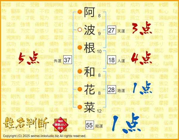阿(8画)波(9画)根(10画) 和(8画)花(8画)菜(12画)