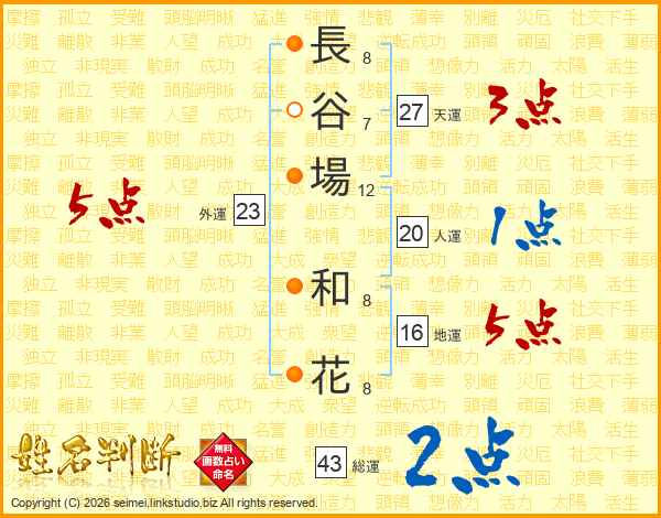 長(8画)谷(7画)場(12画) 和(8画)花(8画)