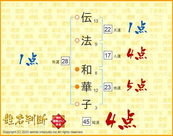 伝(13画)法(9画) 和(8画)華(12画)子(3画)