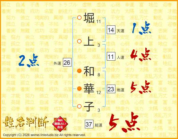 堀(11画)上(3画) 和(8画)華(12画)子(3画)