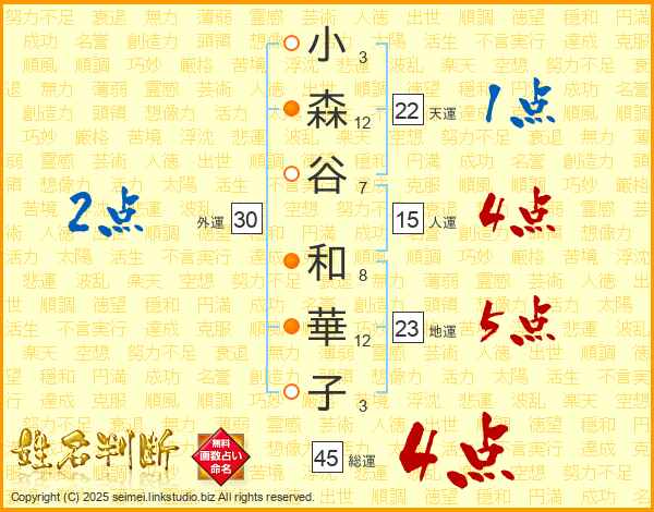 小(3画)森(12画)谷(7画) 和(8画)華(12画)子(3画)