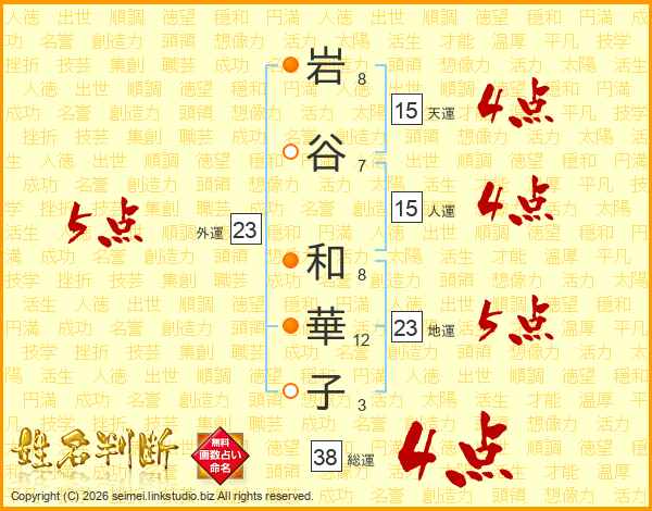 岩(8画)谷(7画) 和(8画)華(12画)子(3画)