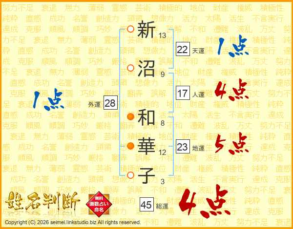 新(13画)沼(9画) 和(8画)華(12画)子(3画)