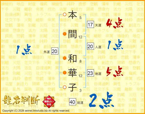 本(5画)間(12画) 和(8画)華(12画)子(3画)