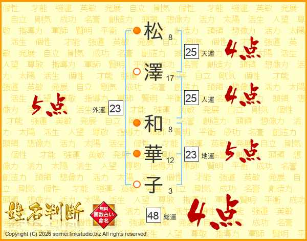 松(8画)澤(17画) 和(8画)華(12画)子(3画)