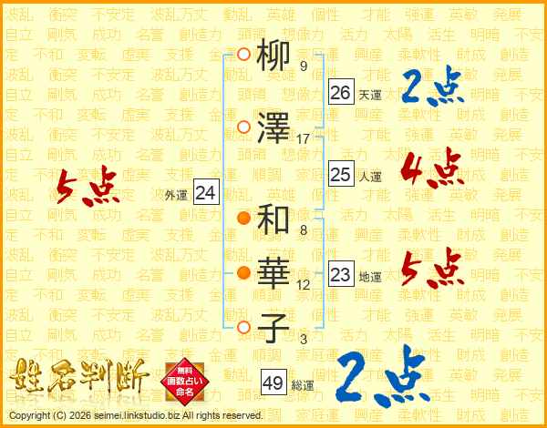 柳(9画)澤(17画) 和(8画)華(12画)子(3画)