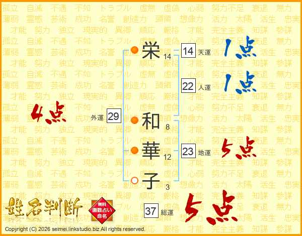 生活面を象徴する運勢です。外部から受ける影響力を表し、結婚運、家庭運や職場、環境への順応性を表します。総運から人運を引いた画数。姓や名が1文字の場合を除く。
