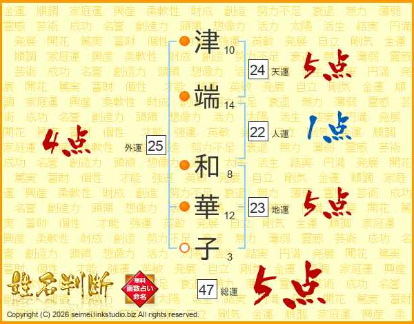 津(10画)端(14画) 和(8画)華(12画)子(3画)