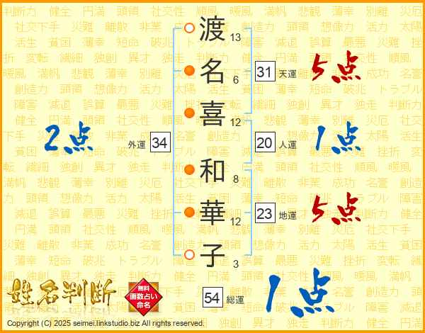 渡(13画)名(6画)喜(12画) 和(8画)華(12画)子(3画)