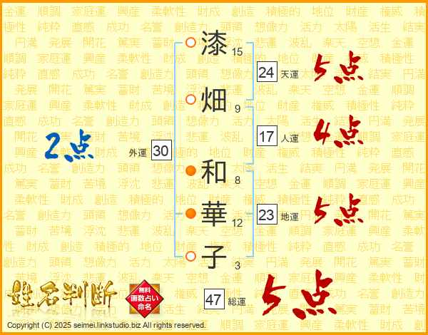 漆(15画)畑(9画) 和(8画)華(12画)子(3画)