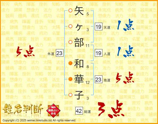 矢(5画)ヶ(3画)部(11画) 和(8画)華(12画)子(3画)