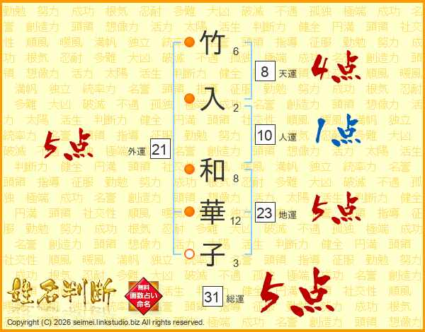 竹(6画)入(2画) 和(8画)華(12画)子(3画)