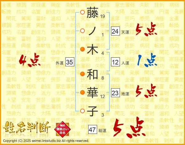 藤(19画)ノ(1画)木(4画) 和(8画)華(12画)子(3画)