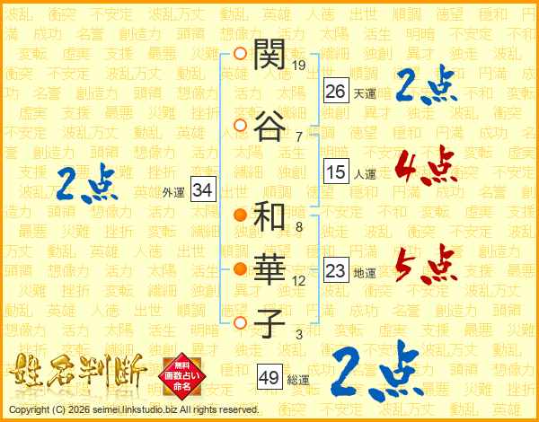 関(19画)谷(7画) 和(8画)華(12画)子(3画)