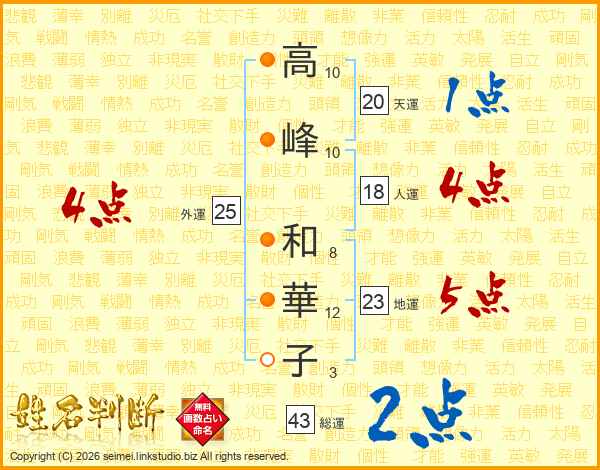 高(10画)峰(10画) 和(8画)華(12画)子(3画)