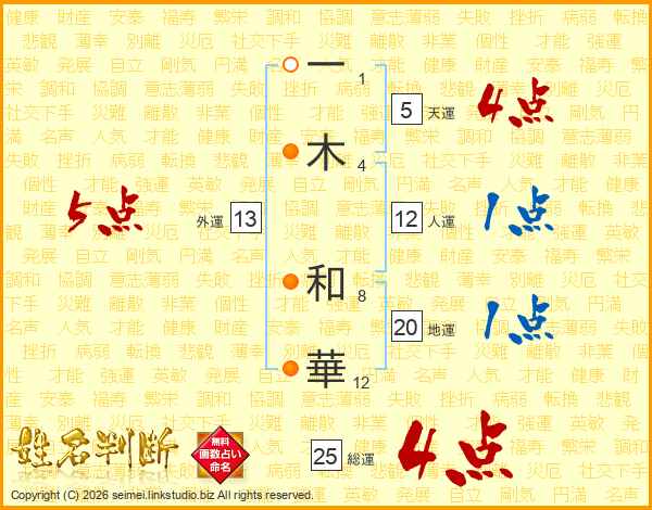 生活面を象徴する運勢です。外部から受ける影響力を表し、結婚運、家庭運や職場、環境への順応性を表します。総運から人運を引いた画数。姓や名が1文字の場合を除く。