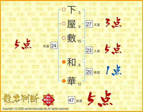 下(3画)屋(9画)敷(15画) 和(8画)華(12画)