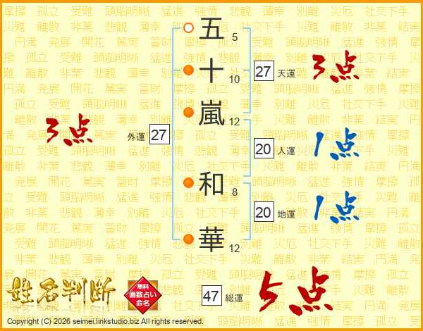 五(5画)十(10画)嵐(12画) 和(8画)華(12画)