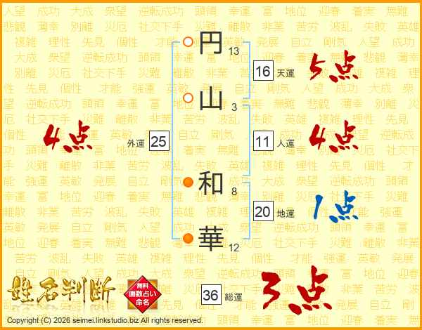 円(13画)山(3画) 和(8画)華(12画)