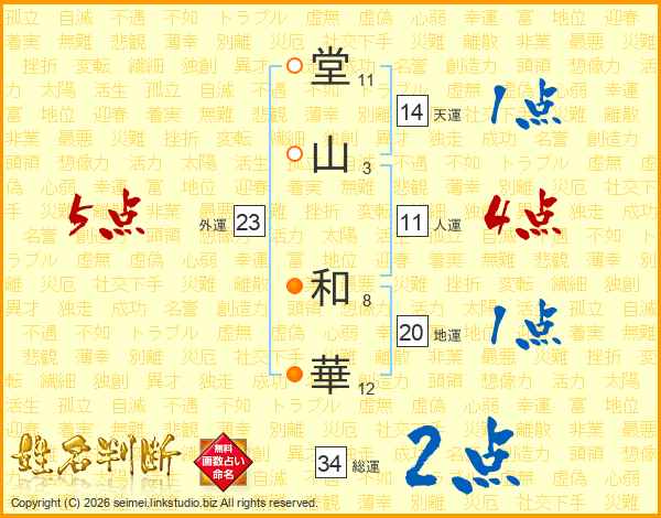 生活面を象徴する運勢です。外部から受ける影響力を表し、結婚運、家庭運や職場、環境への順応性を表します。総運から人運を引いた画数。姓や名が1文字の場合を除く。