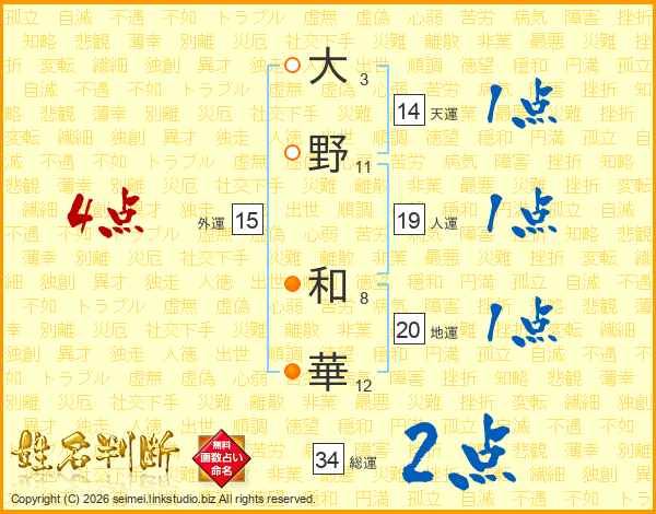 大(3画)野(11画) 和(8画)華(12画)
