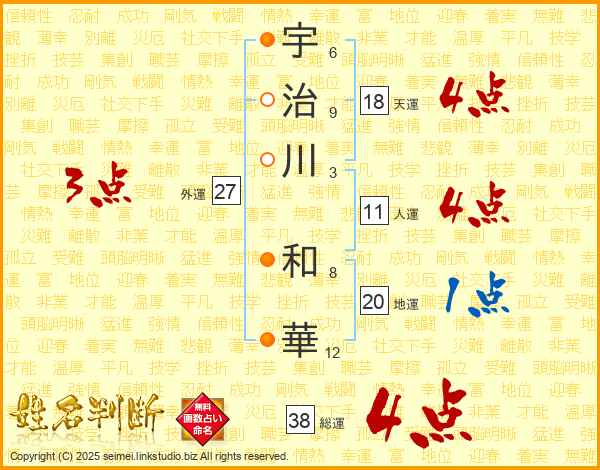 宇(6画)治(9画)川(3画) 和(8画)華(12画)