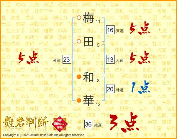 生活面を象徴する運勢です。外部から受ける影響力を表し、結婚運、家庭運や職場、環境への順応性を表します。総運から人運を引いた画数。姓や名が1文字の場合を除く。