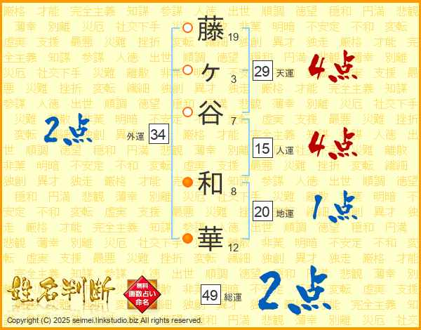 藤(19画)ヶ(3画)谷(7画) 和(8画)華(12画)