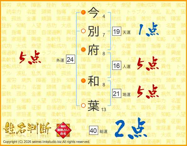 今(4画)別(7画)府(8画) 和(8画)葉(13画)