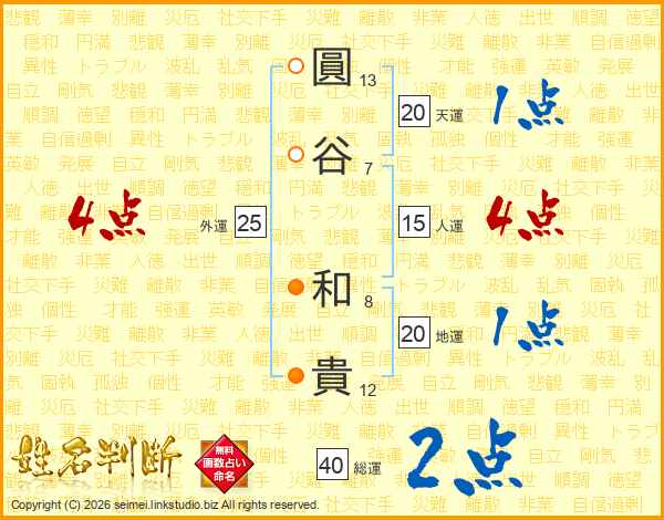圓(13画)谷(7画) 和(8画)貴(12画)