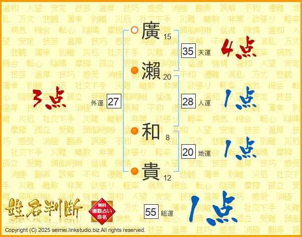 廣(15画)瀨(20画) 和(8画)貴(12画)