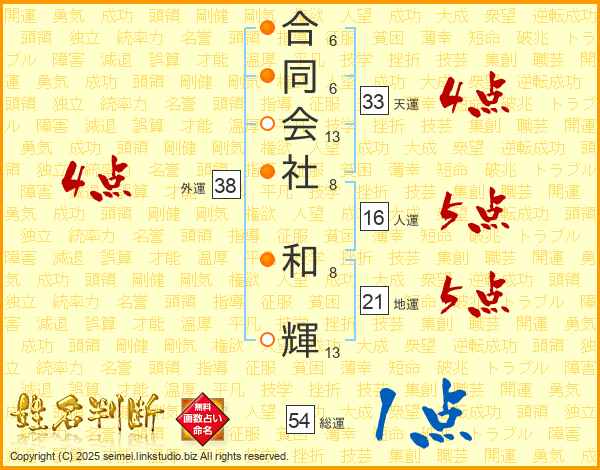 合(6画)同(6画)会(13画)社(8画) 和(8画)輝(13画)
