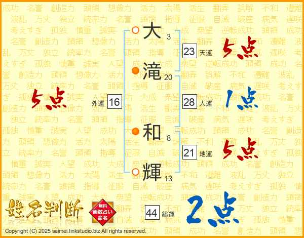 あなたの人生を表す1番重要な運勢です。生涯を通じて影響する総合運となり、主に50歳以降の晩年期に影響を及ぼします。苗字と名前の合計画数。