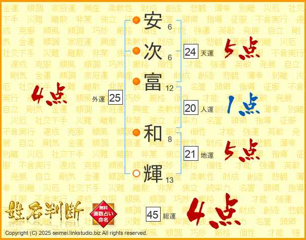 安(6画)次(6画)富(12画) 和(8画)輝(13画)