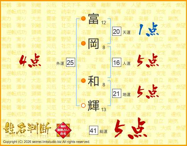 富(12画)岡(8画) 和(8画)輝(13画)