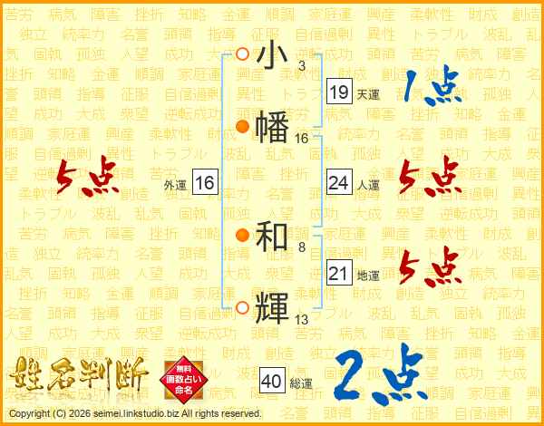 生活面を象徴する運勢です。外部から受ける影響力を表し、結婚運、家庭運や職場、環境への順応性を表します。総運から人運を引いた画数。姓や名が1文字の場合を除く。