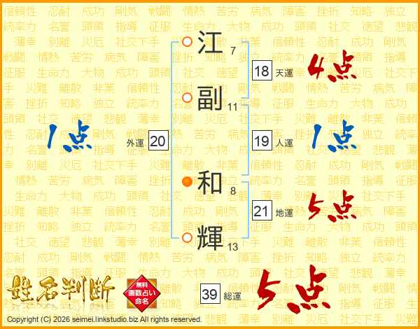 生活面を象徴する運勢です。外部から受ける影響力を表し、結婚運、家庭運や職場、環境への順応性を表します。総運から人運を引いた画数。姓や名が1文字の場合を除く。