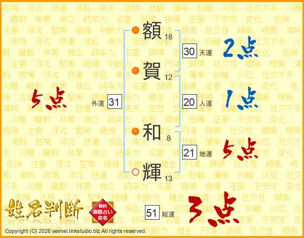 額(18画)賀(12画) 和(8画)輝(13画)