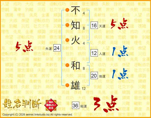 不(4画)知(8画)火(4画) 和(8画)雄(12画)