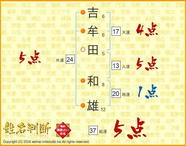 吉(6画)牟(6画)田(5画) 和(8画)雄(12画)
