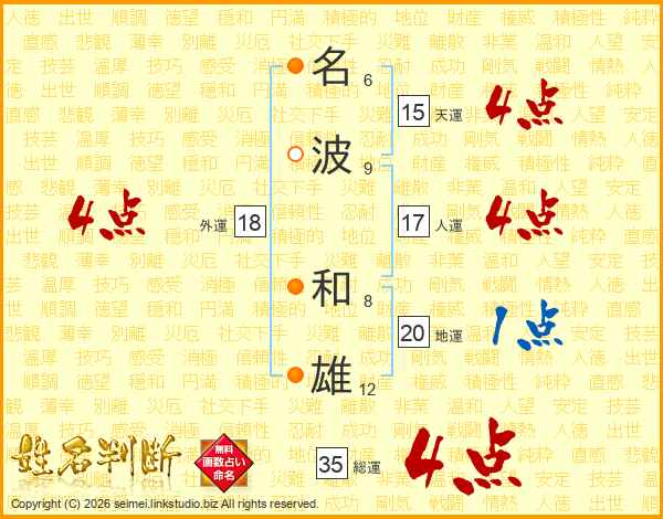 生活面を象徴する運勢です。外部から受ける影響力を表し、結婚運、家庭運や職場、環境への順応性を表します。総運から人運を引いた画数。姓や名が1文字の場合を除く。