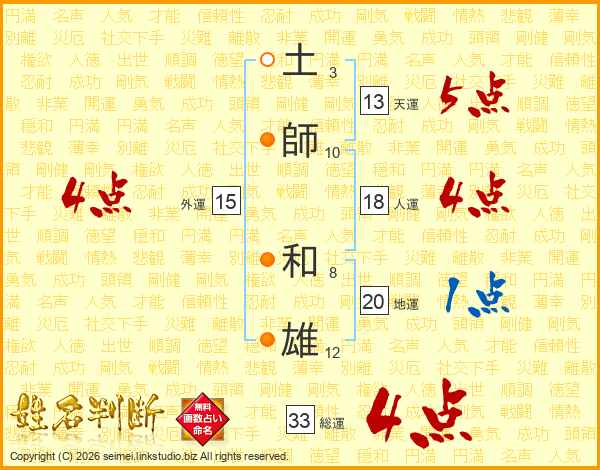 土(3画)師(10画) 和(8画)雄(12画)