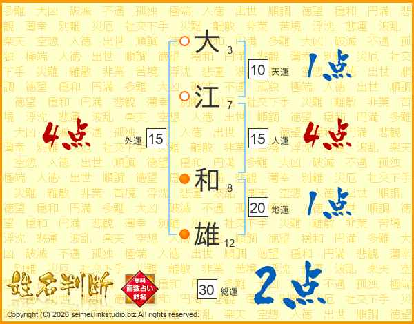 大(3画)江(7画) 和(8画)雄(12画)