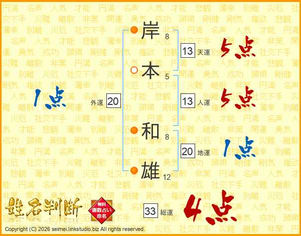 岸(8画)本(5画) 和(8画)雄(12画)