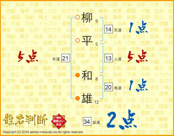 柳(9画)平(5画) 和(8画)雄(12画)