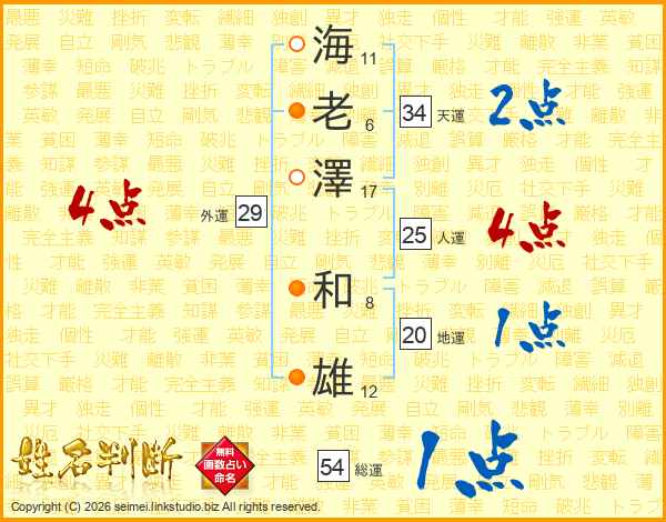 海(11画)老(6画)澤(17画) 和(8画)雄(12画)