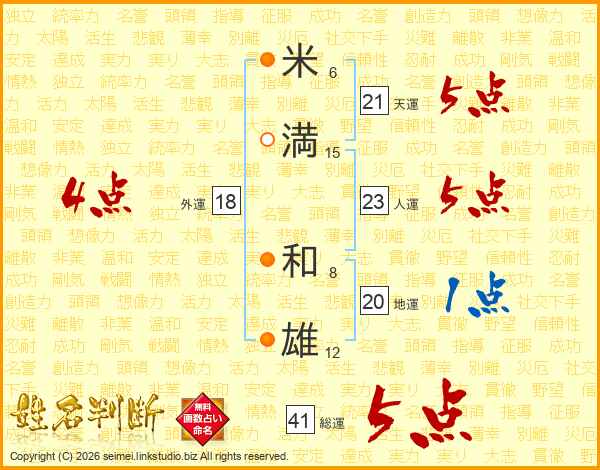 米(6画)満(15画) 和(8画)雄(12画)