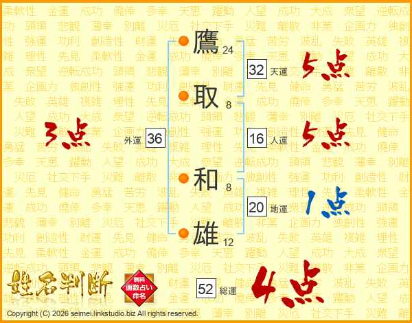 鷹(24画)取(8画) 和(8画)雄(12画)