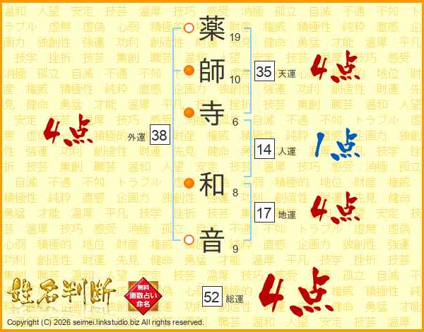 薬師寺和音さんの総運は52画の4点!
