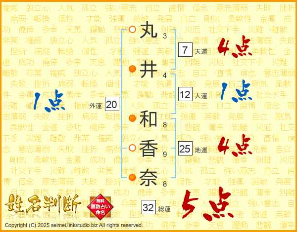 丸(3画)井(4画) 和(8画)香(9画)奈(8画)